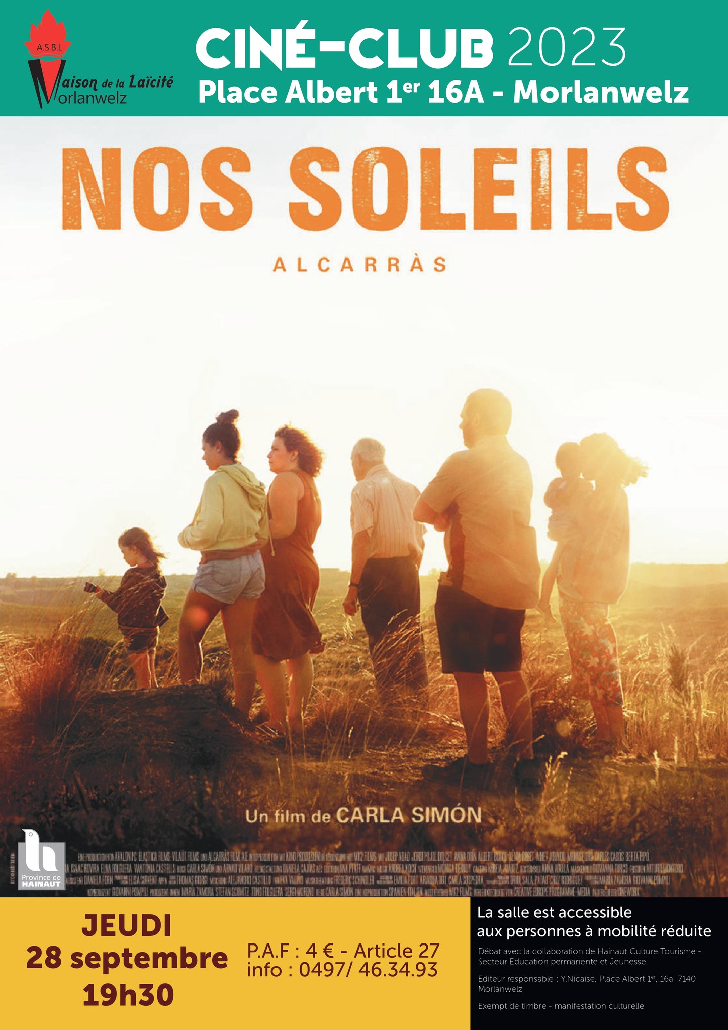 La Maison de la Laïcité de Morlanwelz vous invite à son prochain ciné-débat « Nos soleils », de Carla Simon. À la fois social et politique, « Nos soleils » nous offre une magnifique fresque familiale, touchante, vivante, joyeuse et poignante.