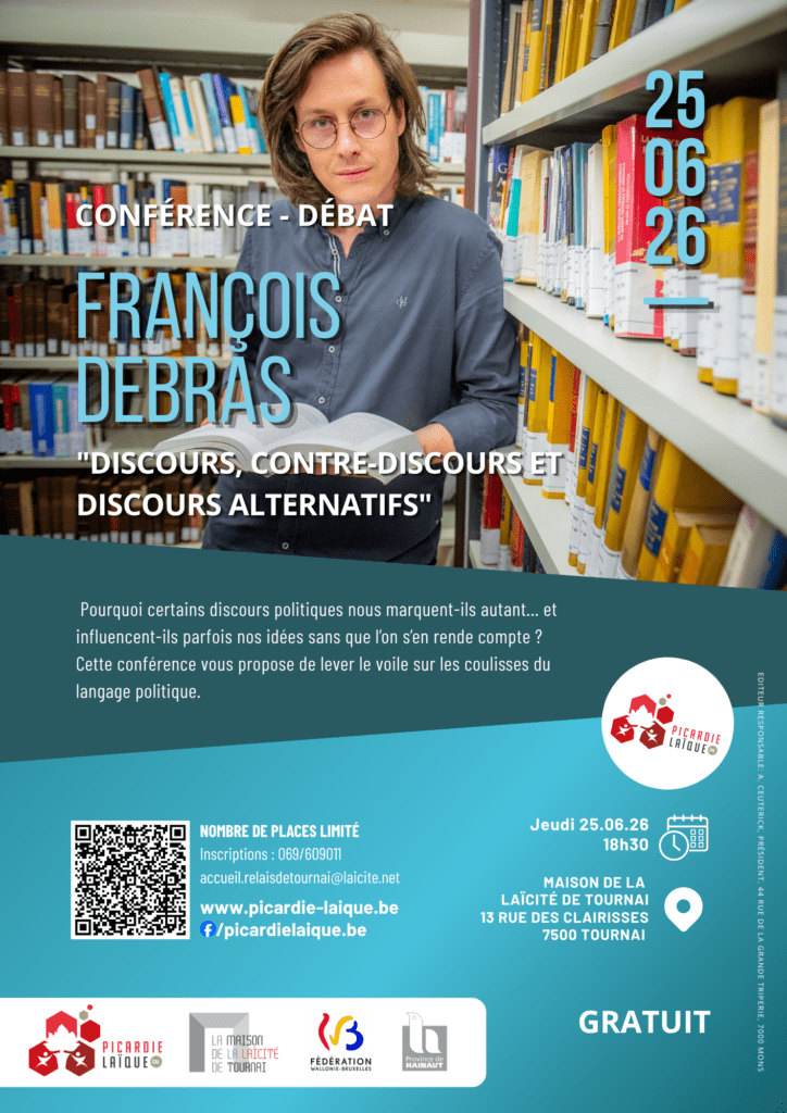 François Debras, docteur en sciences politiques et sociales et professeur associé au Centre d’Études Démocratie de la Faculté de Droit, de Science politique et de Criminologie de l’Université de Liège, viendra présenter son nouvel ouvrage intitulé Discours, contre-discours et discours alternatifs, à la Maison de la Laïcité de Tournai, en mai prochain.