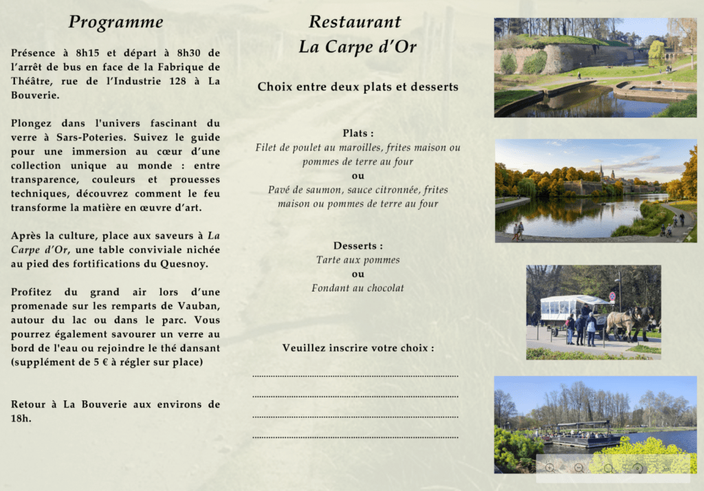 La Maison de la Laïcité de Frameries vous invite à profiter du grand air lors d’une promenade sur les remparts de Vauban, autour du lac ou dans le parc. Vous pourrez également savourer un verre au bord de l’eau ou rejoindre le thé dansant (supplément de 5 € à régler sur place).